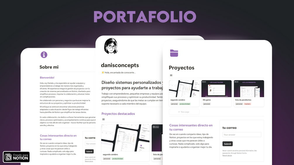 Este portafolio en Notion no solo te permite mostrar tus proyectos y experiencia, sino que también integra herramientas para organizar tu flujo de trabajo y destacar como Project Manager y creador de sistemas en Notion. Todo está diseñado para ser fácil de usar, personalizable y visualmente atractivo, sin necesidad de habilidades técnicas avanzadas.